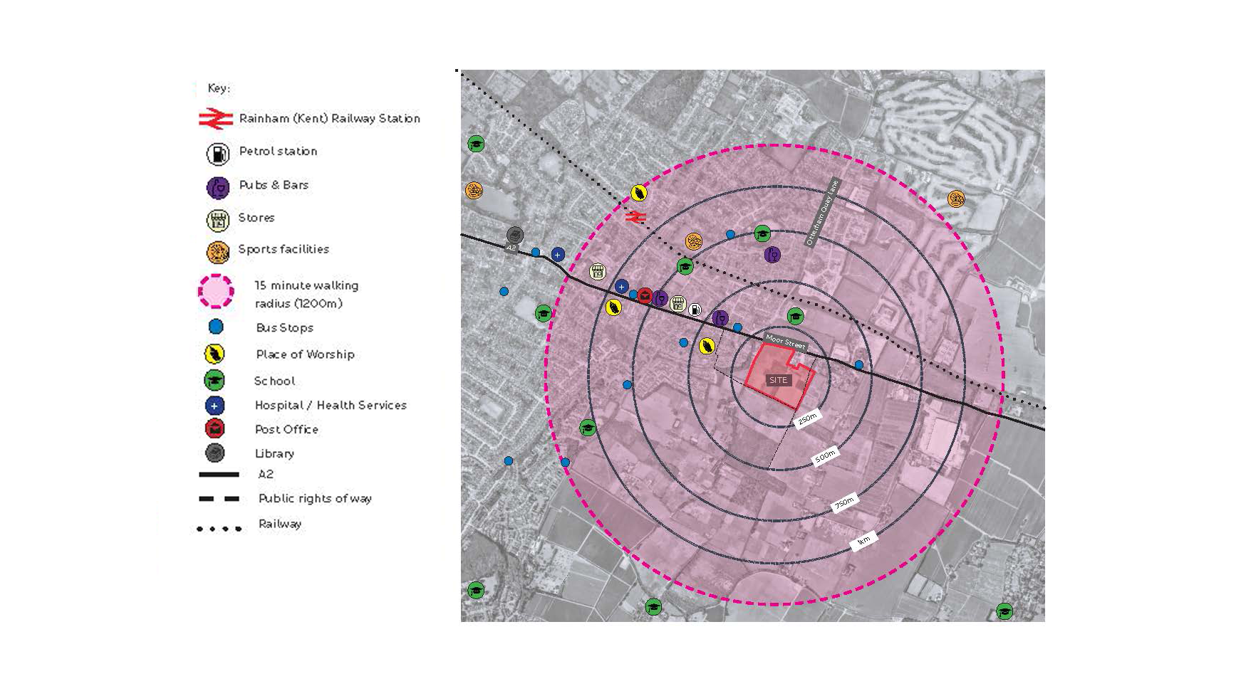 As demonstrated in the facilities plan below, the Site is well located in close proximity to a range of services and facilities which are within walking and/or cycling distance of the Site. The majority of services to meet the day-to-day needs of residents are within 1km of the Site, which includes access to bus and rail services.